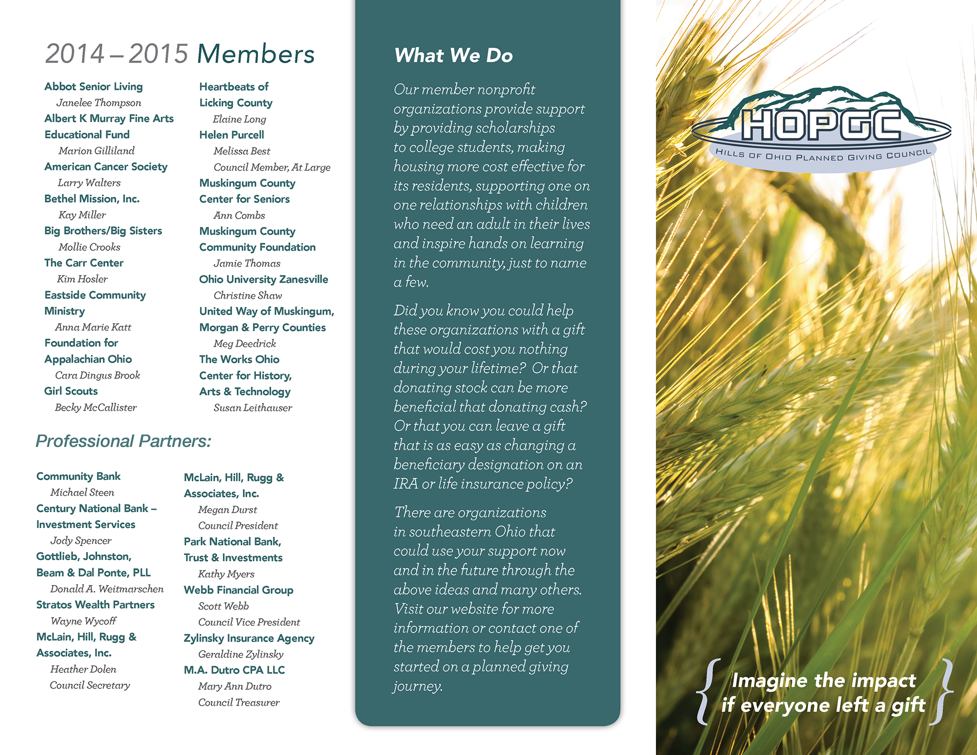 My freelance graphic design position for the Hills of Ohio Planned Giving Council included developing a brand image, as well as producing a brochure and multiple postcard variations for their business. This division of the Muskingum County Chamber of Commerce is a nonprofit organization that provides a professional resource for the charitable gift planning community.